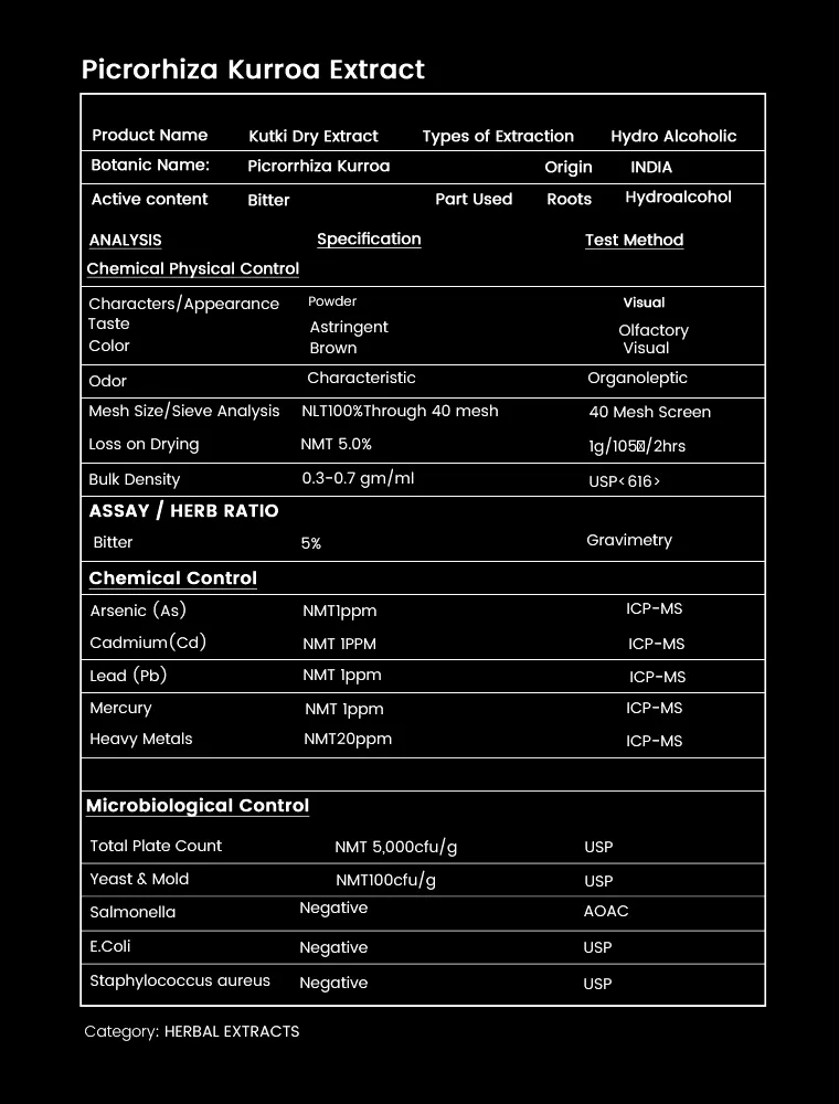 We manufacture and export Picrorhiza kurroa Root Extracts in bulk, complying with USFDA, TGA, MEDSAFE and EU guidelines. Besides being organically formulated, it undergoes stringent quality tests before getting dispatched to use in the market. We keep up with the latest advancement in the industry and incorporate them in our process to deliver superior and uncompromised range as promised.